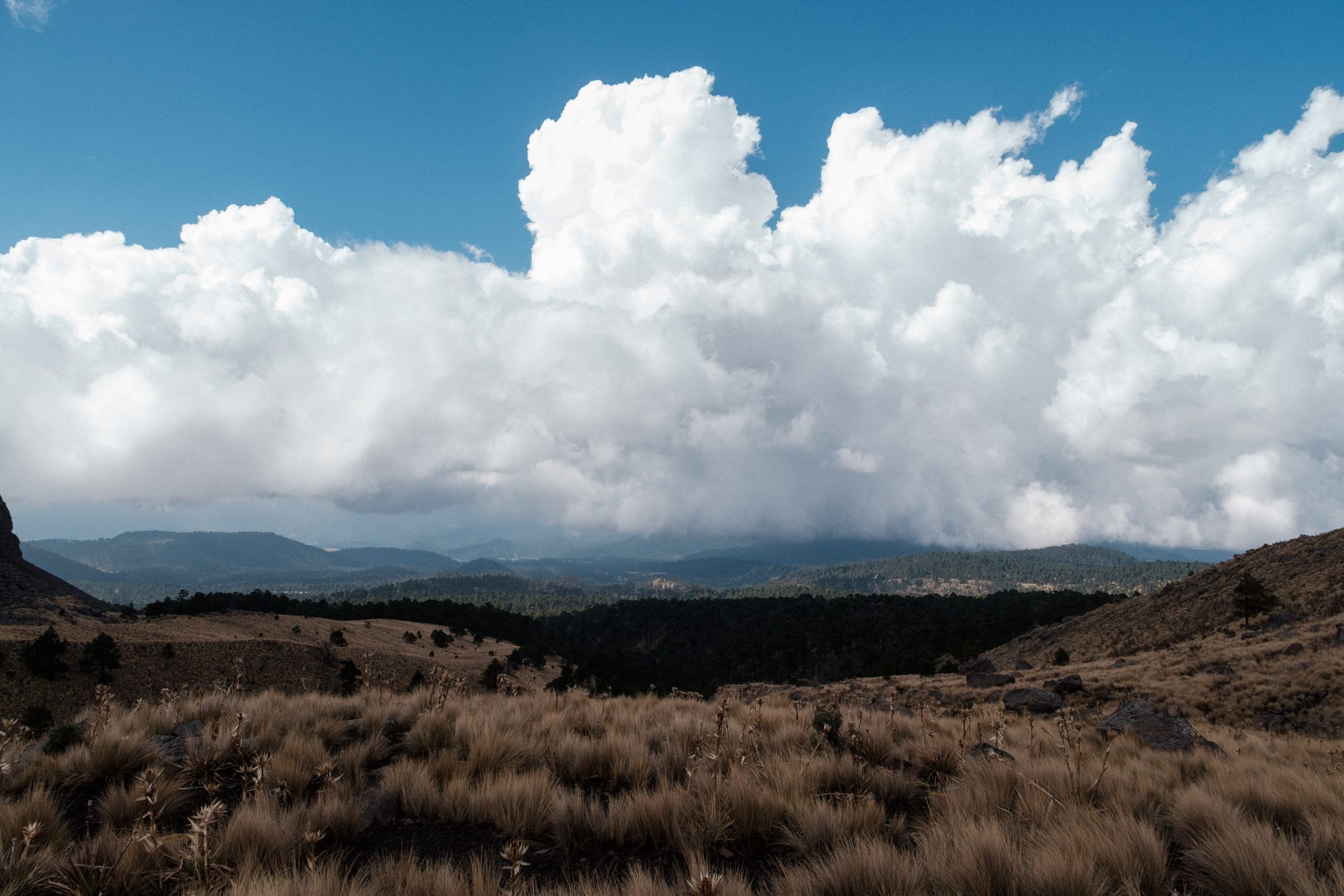 Eventually, the trail starts to get steeper and you will slowly rise past the treeline and crest a large grassy bank. Prepare to be amazed, because this is where the views really start to open up. Dramatic mountains lie ahead, and an expansive valley lies behind. If it’s not too cloudy, you’ll finally get a look at Nevado de Toluca and Pico del Fraile. The trail evens out for a bit as you follow along the top of the bank.
