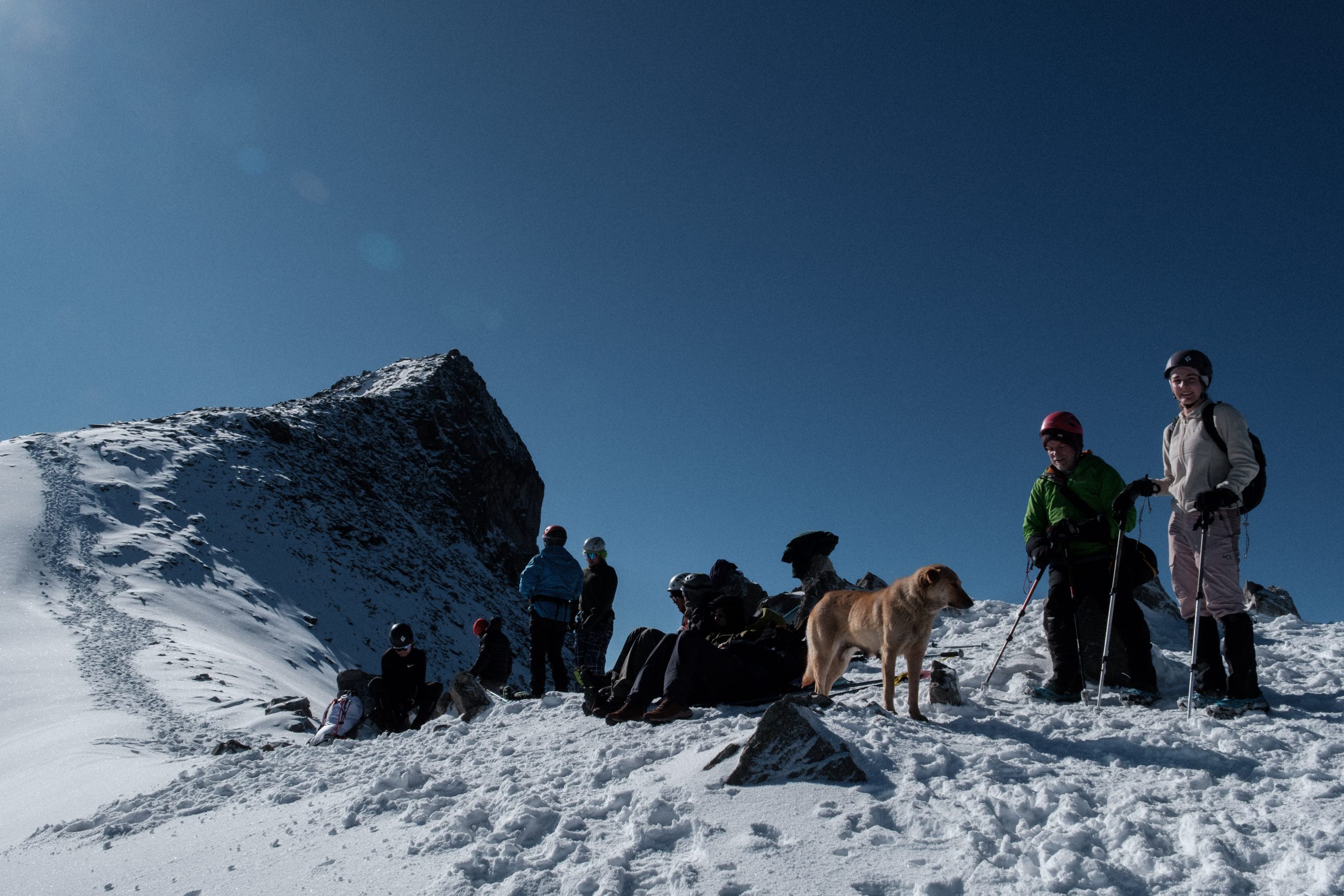 We made our way up the mountain the next morning, shaking off our nerves from the unsettling experience the night before. As we ascended the now snowy ridge on our way to the summit, we saw something sticking its head up from behind the rocky outcrop above. Difficult to see at first, as we got closer we realized what it was. Illuminated by the morning sun, Pedro was cheering us on from just below the summit! What a good boy. He is clearly an experienced mountain dog, and probably knew of just the place to go in the event of such a storm as the night before.