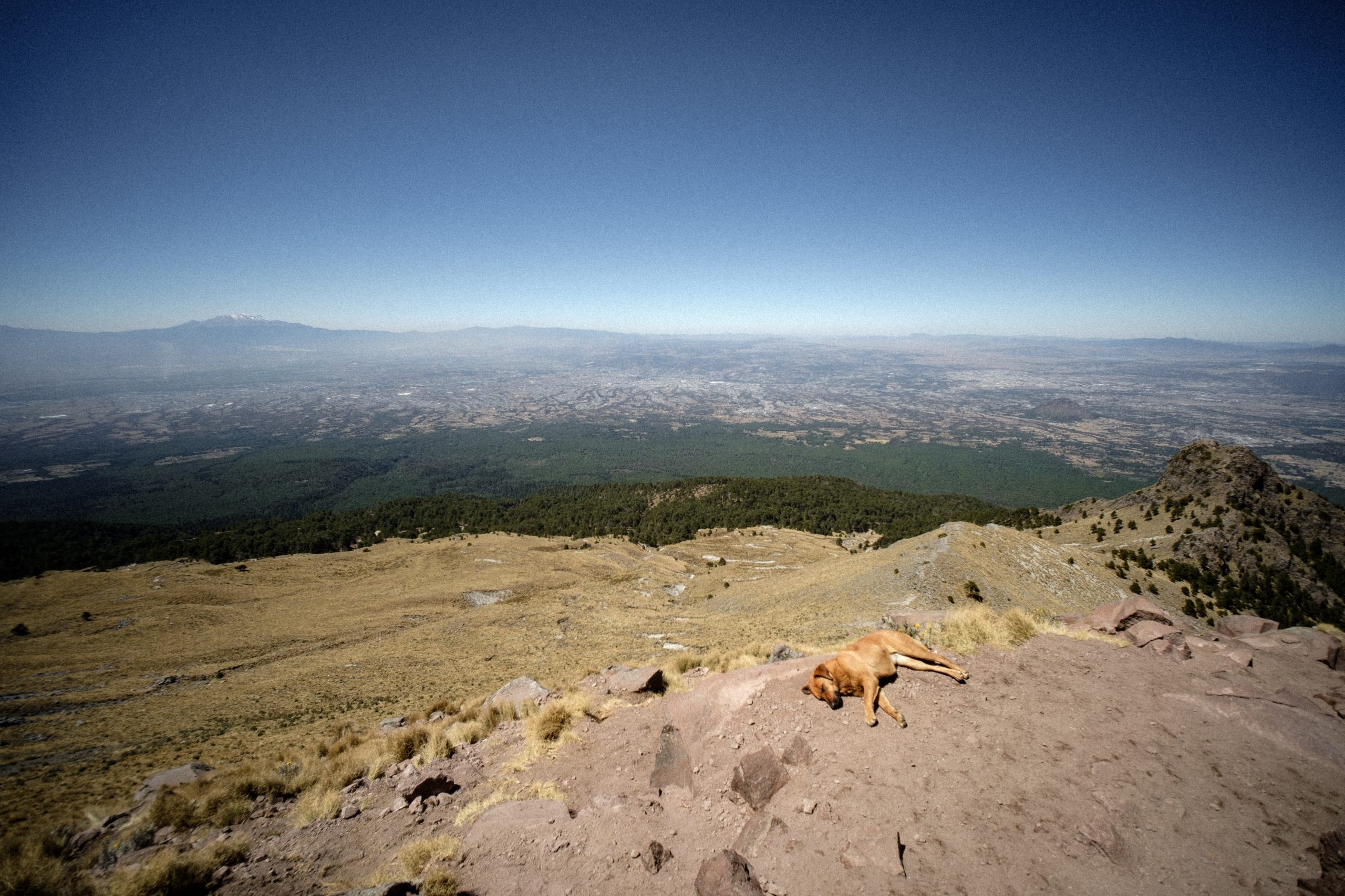 After about 5.3 km you rise out of the forest and reach a bit of a plateau where the trail evens out. When we were there, this is apparently where all the stray dogs hang out. Shortly after this, you’ll reach a spot where the trail splits in two and gets a lot steeper and more difficult. It is best to follow the direction shown in the signage posted on the trail and ascend towards climbers right. This trail is more solid, while the left hand trail has much more volcanic sand and scree that will force you to take one step forward and two steps back. As you continue up this part of the trail, the views start to get really spectacular. To your right, you will be able to see Mexico’s highest mountain, the perpetually snowcapped Pico de Orizaba. This was our first view of Orizaba, and we were set to climb it only a few days after La Malinche. Its steep slopes looked incredibly daunting, and seeing it from afar definitely incited both excitement and a healthy dose of fear. On the left, Iztaccíhuatl and Popocatépetl are visible. If you are lucky, the active Popocatépetl will be letting out puffs of smoke.